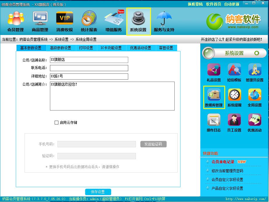 选择好行业分类之后,勾选“启用云存储”。然后,在下方输入手机号码,点击发送验证码,然后会收到一条署名“会员通”的短信,填入收到的验证码,点击保存即可启用云存储。