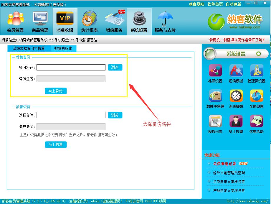然后点击进入数据库管理,选择备份路径。选择好备份路径之后,点击马上备份即可完成手动备份。如下图