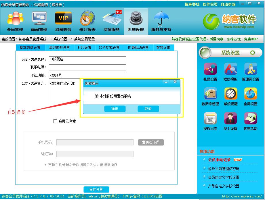 自动备份如下图所示,关闭软件是,软件会弹出提示“本地备份后退出系统”,点击确定退出软件即可完成自动备份数据。