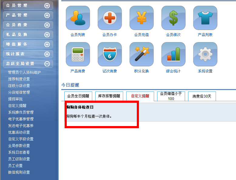 通过自定义的方式去实现服务计划,提醒狗狗在什么时间要做身体检查。比如半个月之内狗狗要做检查的话,就设定半个月后提醒下,然后可以给提醒的会员发送短信,提供服务质量和会员满意度。