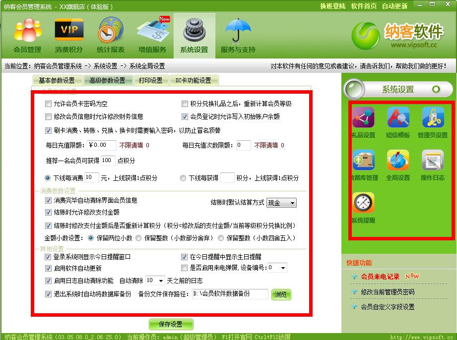 6.系统设置:在这里商可以对店面、会员、会员卡基本参数设置、高参数设置、打印设置。