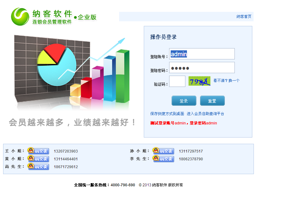 可以添加快捷方式在桌面,方便登陆。输入账号密码,总的账号admin是不能修改的,密码商自己可以重新设置。会员自助查询平台,会员可查询到自己的消费情况,积分情况,以及推荐人的所有消费。