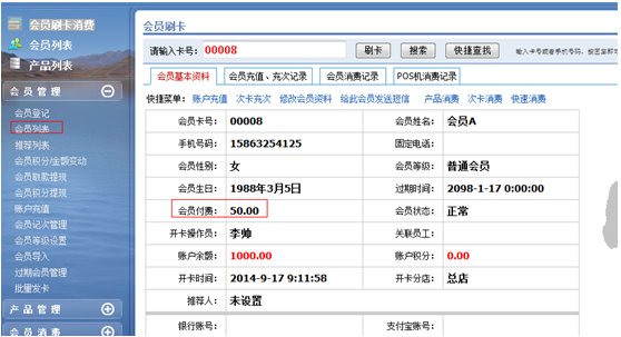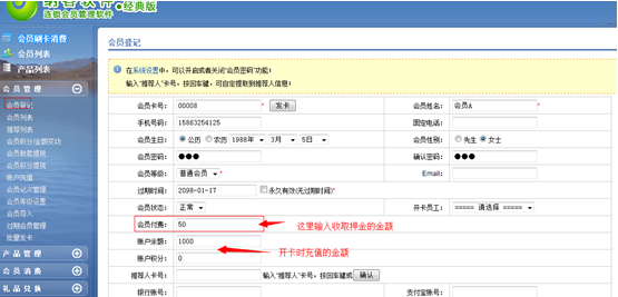 操作步骤:会员开卡的时候,在会员付费这里输入付费金额,这个部分可以作一押金后期退换的部分。