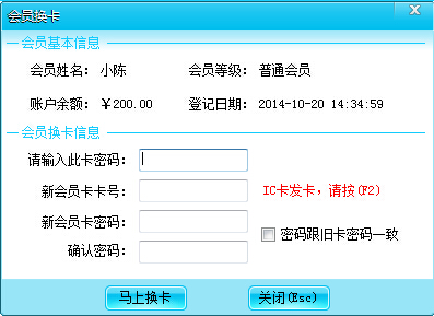 依次输入旧会员卡密码、新卡卡号、新卡密码,即可完成换卡功能。