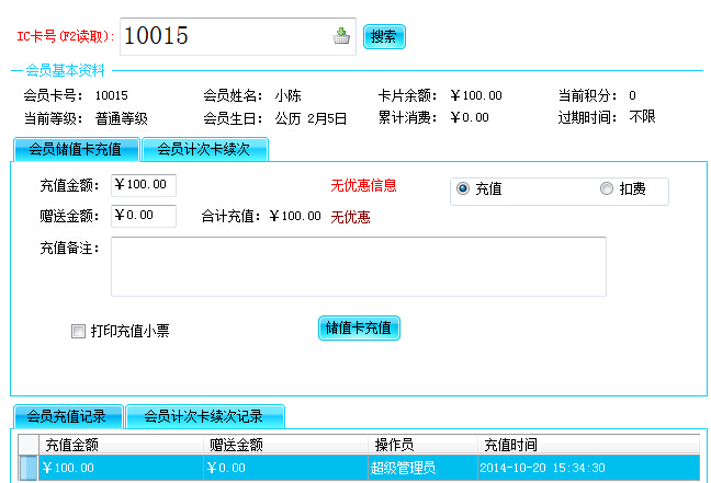 2、输入会员卡号或者手机号码,按回车键,系统会自动调出会员基本信息;