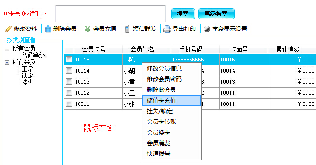2、找到要充值的会员,点击鼠标右键,选择“储值卡充值”项,如下图: