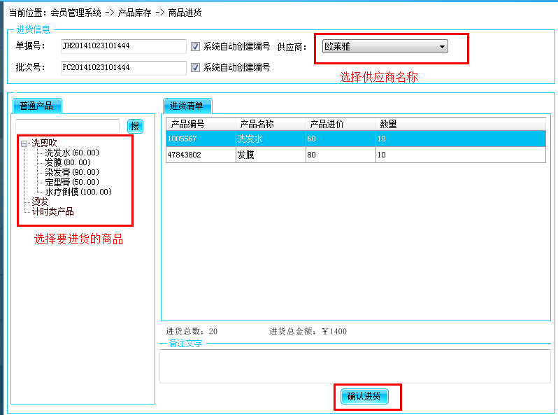 3.选择完成进货产品以后,点击【确认进货】按钮。