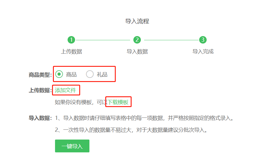 在“商品列表”点击“导入”即可打开产品数据批量导入操作界面。如下图: