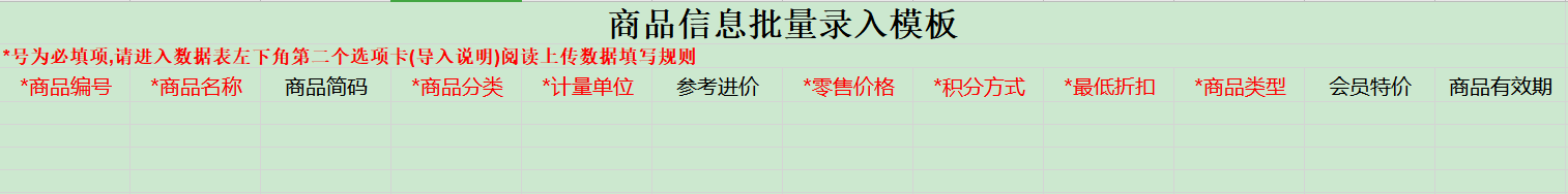 3、商品类型、商品类别编码、产品/礼品积分、商品最低折扣、计量单位以及分店编号按照 下载模板上的要求严格填写;